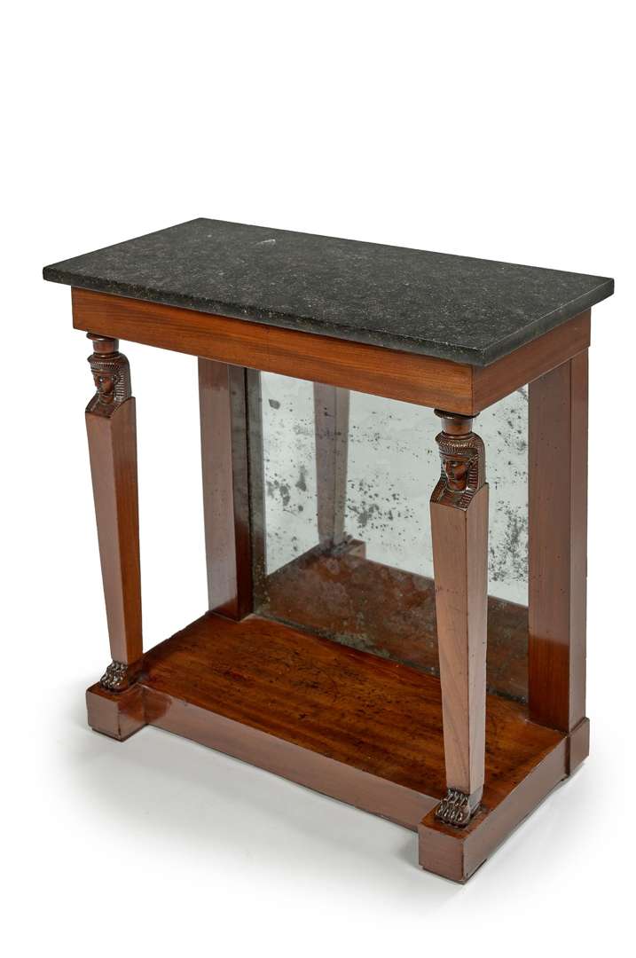 CONSOLE EN ACAJOU et placage d'acajou, montants antérieurs en cariatide, en bois sculpté de tête d'égyptienne, fûts gaines en placage d'acajou, sur pieds sculptés, l'ensemble réuni d'une base d'entretoise et fond miroir (piqûres).