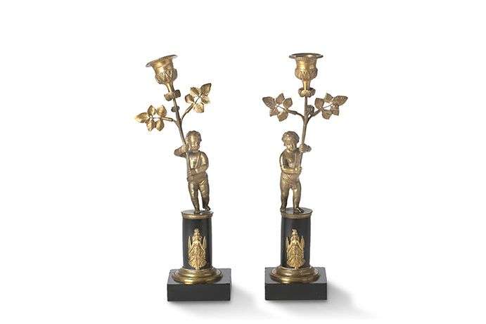 PAIRE DE FLAMBEAUX en bronze ciselé figurant deux chérubins brandissant un