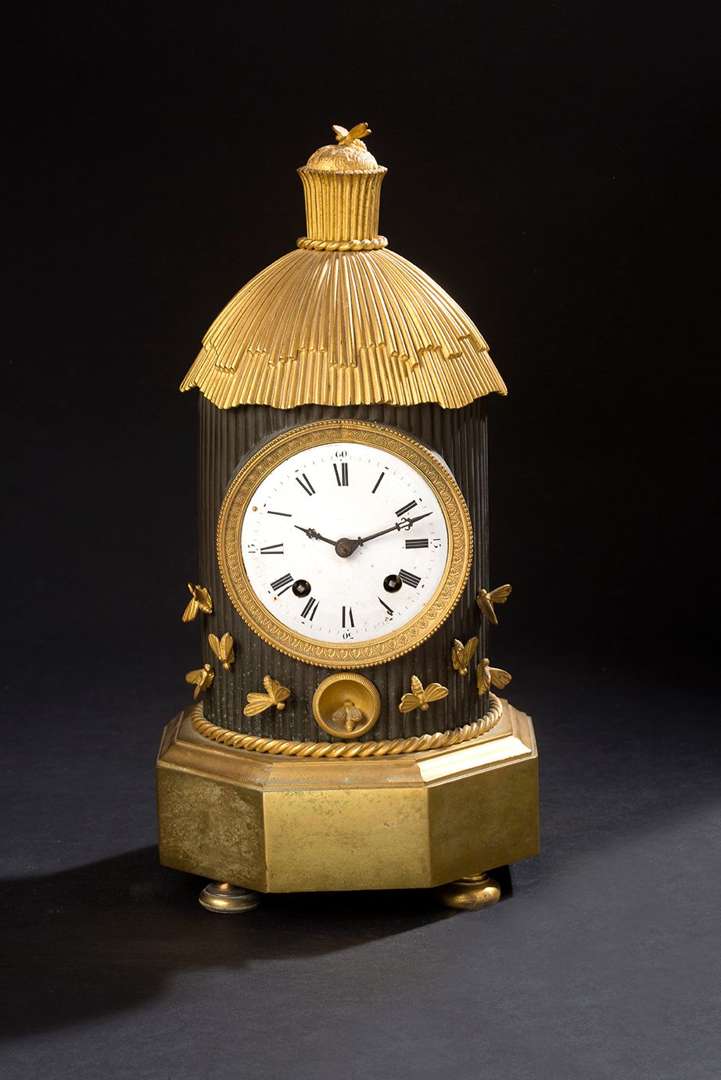 RARE PENDULE RUCHE en bronze à patine brune et dorée, le cadran émaillé blanc à chiffres romains, enchâssé dans une ruche sur laquelle sont posées des abeilles au naturels sur le corps et le trou d'envoll. Base octogonale reposant sur des pieds boulles applaties.