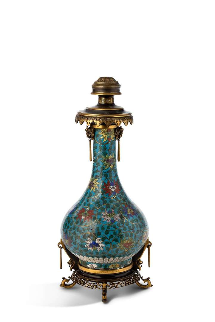 PAIRE DE VASES MONTES Paire de vases bouteilles de forme balustre en émaux cloisonnés de feuillages et fleurs de lotus.