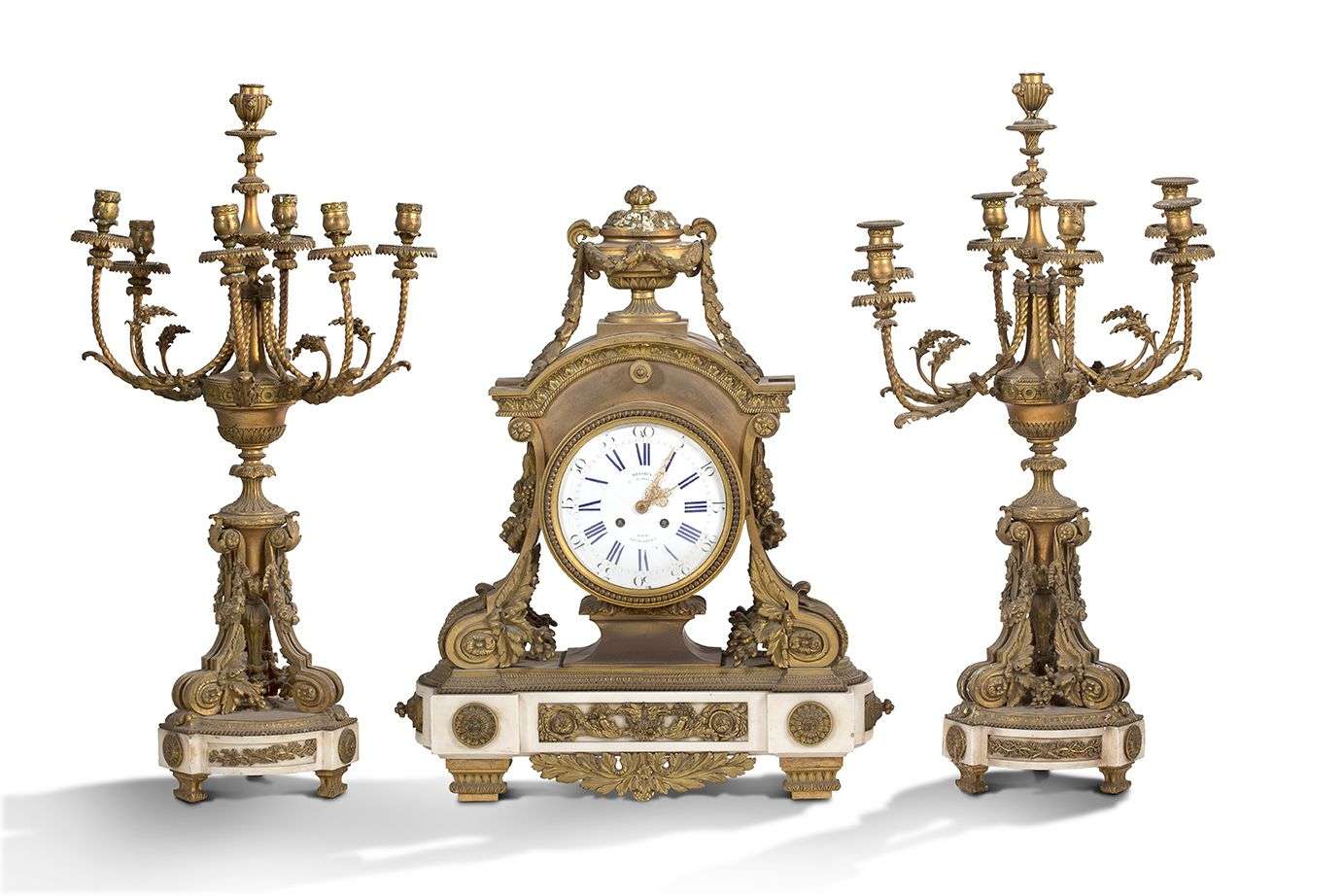 IMPORTANTE GARNITURE DE CHEMINÉE composée d'une pendule et de deux candélabres à sept bras de lumières.