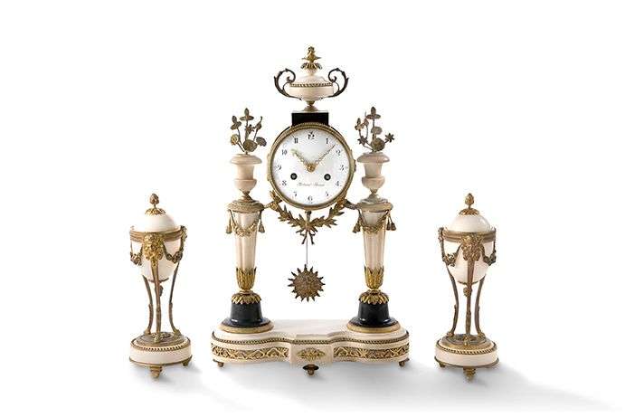 GARNITURE DE CHEMINÉE en marbre blanc et bronze ciselé comprenant une pendule portique, le cadran émaillé supporté par deux colonnes cannelées surmontées de vases fleuris.