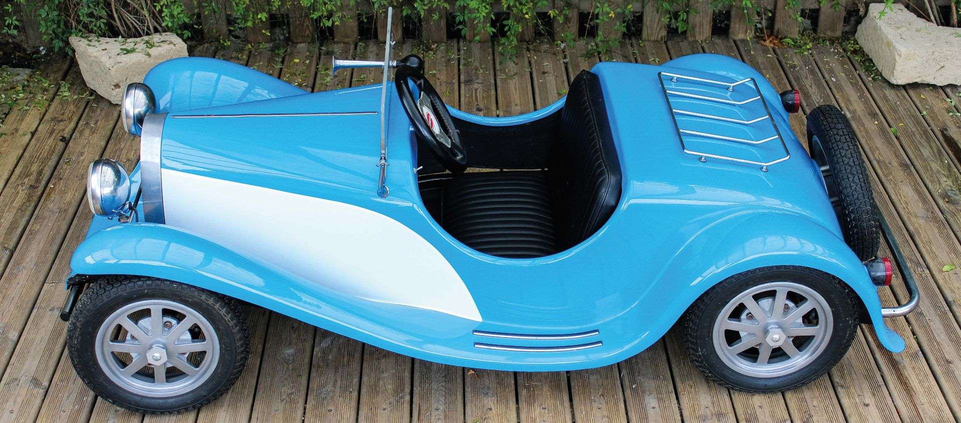 Au milieu des années 1970, l’entrepreneur français Xavier de La Chapelle reprend la tradition familiale, en construisant à son tour des automobiles. Au début du siècle, ses aïeux avaient en effet fabriqué des voitures dans la région de Saint-Chamond, sous la marque Stimula-De La Chapelle Frères et Cie. Il fait donc renaître la marque de ses cendres pour homologuer et distribuer d’intéressantes évocations de la plus mythique des Bugatti de route, la fameuse Type 55 Roadster, dessinée en son temps par un très inspiré Jean Bugatti. Si la première De La Chapelle voit le jour en 1976, à la grande époque des répliques et évocations néo-rétro, il faut attendre 1979 pour que Xavier ne se lance dans les jouets motorisés pour enfants. Il dessine une mini Jeep, une BMW 328, une Ferrari 330 P2 et, celle qui l’a fait connaître à l’échelle 1, une Bugatti Type 55 Roadster. « Ces superbes reproductions sont fabriquées entièrement à la main, et réalisées avec les standards de qualité qui ont fait la réputation de la marque », peut-on lire sur le site de la petite firme française. « En France, il existe encore des entreprises artisanales où l’on aime construire avec passion, comme au début du siècle, et ce pour le plus grand plaisir des conducteurs en herbe. Ceux-ci éprouvent à des vitesses raisonnables, des sensations aussi intenses que leurs aînés au volant du modèle original. Doit-on parler de jouets, ou de véhicules automobiles ? Objets rares, construits avec amour, les Junior De La Chapelle, dont chaque exemplaire est numéroté, sont des objets de collection et de décoration. » L’exemplaire Star 55 que nous présentons, châssis numéro 00351, est donc une réplique à l’échelle 1/2 de la Bugatti Type 55 Roadster, qui aurait été construite à plus ou moins 200 exemplaires et distribuée à l’époque par la société Arola. Le châssis tubulaire reçoit un moteur Sachs Saxonette 2-temps de 49,9 cm3 avec deux vitesses automatiques et embrayage centrifuge. La transmission se fait par chaîne, et l’essieu arrière dispose d’un frein à tambour. La voiture, dont la carrosserie en polyester renforcé fut récemment repeinte, possède tous ses éléments spécifiques : calandre en aluminium, porte-bagage chromé, roues en alliage type Bugatti Grand Prix, volant gainé, klaxon poire, pare-brise rabattable, feux et phares. La banquette 2-places en simili cuir est prête à recevoir deux enfants, ou un adulte (1,75 m maximum et corpulence svelte !) puisque le pédalier est réglable. C’est bientôt Noël… et il n’est pas trop tard pour que votre progéniture ne prenne le départ de la course Little Big Le Mans lors de la toute prochaine édition du Mans Classic.