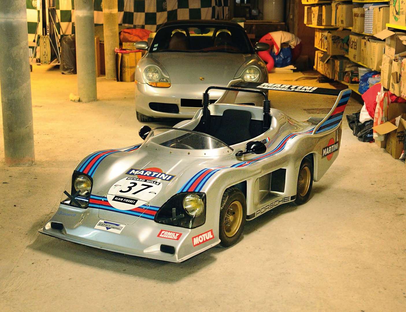 Conçue pour participer au championnat du monde des voitures de sport (Groupe 6) en 1976, la Porsche 936 était une barquette reprenant nombre d’éléments de la Porsche 917. Elle était motorisée par un Flat 6 turbo de 2,1 l repris à la Carrera RSR Turbo de 1974. Championne du monde 1976 (5 victoires absolues pour 7 épreuves), elle remporta également les 24 Heures du Mans sous les couleurs du Martini Racing Team avec Gijs van Lennep et Jacky Ickx (1ère victoire d’un moteur turbo), ainsi que le Groupe 6 du Player’s 200 (200 miles du Grand Prix de Mosport). Cette charmante réplique de la mythique Porsche 936 du Mans fut réalisée par un artisan très inspiré dans les années 80. La carrosserie est en fibre et reprend les couleurs Martini, célèbre sponsor de la marque de Stuttgart. Le châssis est tubulaire et réalisé avec grand soin. Le moteur est un 125 cm3 Sachs accouplé à une boîte à vario qui permet d’atteindre une vitesse de 40 km/h environ ! Devant de telles performances, heureusement les freins sont hydrauliques. Tout le faisceau électrique de la voiture est fonctionnel, avec des vrais phares à l’avant pour parfaire l’esprit d’époque. Adorée par des jeunes pilotes en herbe, elle participera deux fois au Little Big Mans en 2014 et 2016 à l’occasion du Mans Classic organisé par Peter Auto. Aujourd’hui les enfants ont grandi et il est temps d’en faire profiter d’autres, qui ont aussi, des étoiles dans les yeux.