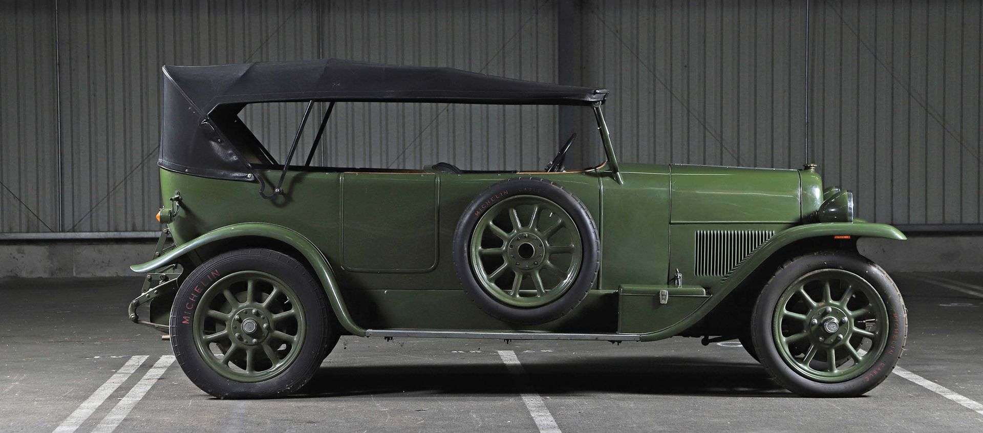 La voiture que nous présentons est une Fiat 505 Torpédo fabriquée en 1924. Elle a bénéficié d’une restauration complète il y a de nombreuses années et se trouve aujourd’hui dans un bon état général. On notera la belle patine de l’ensemble qui lui confère un certain charme. Sa carrosserie présente une teinte verte avec rappel de cette couleur sur le châssis, les jantes ou encore les tambours de freins. Dans l’habitacle on retrouve une sellerie de cuir noir avec moquettes assorties. Le tableau de bord en bois possède un élégant liseré clair que l’on retrouve également sur les boiseries des portes. Les différents compteurs sont bien présents et en bon état. Sous le capot, on retrouve le 4-cylindres 3,0 l tipo 105 qui nécessitera une remise en route. La capote de notre torpédo se trouve également dans un état satisfaisant, et on notera la présence de side-screens contemporains permettant de se protéger des intempéries. Notre bel exemplaire est aujourd’hui présenté à la vente sans prix de réserve, il constitue ainsi une belle opportunité pour tout amateur de la marque turinoise.