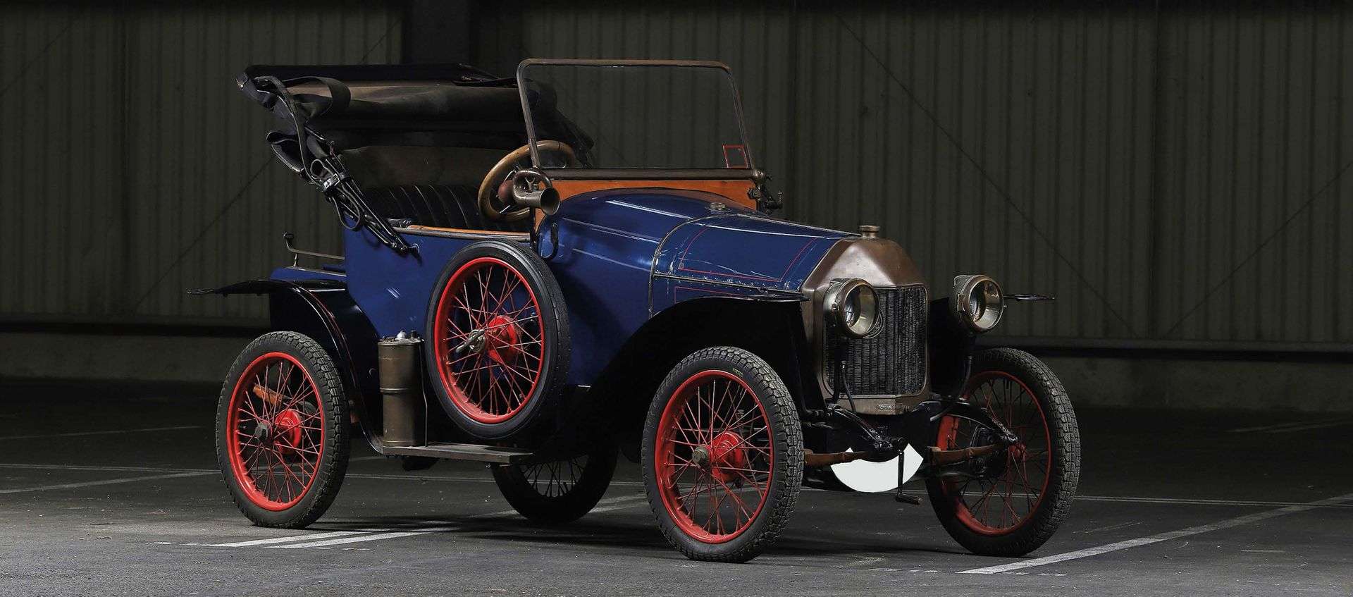 La première voiture française populaire s’appelle Le Zèbre ! Fils d’un cafetier de Cahors et diplômé de l’École de commerce et d’Industrie de Bordeaux, Jules Salomon côtoie Beau de Rochas, pionnier du moteur à explosion, qui l’initie à la mécanique. Il travaille ensuite chez Georges Richard (devenu Unic en 1904), constructeur automobile éclectique, et s’y lie d’amitié avec Jacques Bizet, commercial de la marque et fils du compositeur de Carmen, qui rêve d’inscrire son nom au panthéon de l’automobile. Ensemble ils développent la Type A en 1909. Ils quittent alors tous les deux George Richard pour s’installer à Suresnes, d’abord sous la raison sociale Bizet constructions puis, en 1911, SA des Automobiles Le Zèbre. C’est en effet un véritable succès commercial, et chacun veut donner son nom à la voiture : on choisit finalement Le Zèbre, a priori le surnom d’un commis de chez Unic... Deux hommes d’affaires influents, Akar et Joseph Lamy (futurs fondateurs d’Amilcar), deviennent les financiers de l’entreprise alors que Baudry de Saunier, rédacteur en chef du magazine de référence Omnia est choisi comme parrain de la marque. Les Le Zèbre poursuivent une brillante carrière. A 3 000 F, la Type A est la voiturette la moins chère du marché. La gamme s’étoffe avec les types B (4-cylindres 785 cm3, 4-places) et C (torpédo 4-cylindres, 2 places), plus élégantes. Elles acquièrent une réputation de robustesse et de fiabilité et sont adoptés par l’armée française comme véhicule de liaison pendant la première Guerre Mondiale. L’exemplaire présenté à la vente est une intéressante Type C 13 qui bénéficia d’une belle restauration. Elle se présente à nous dans une jolie robe bleue, avec des ailes de couleur noir avec des liserés rouge, comme les jantes à rayons. En très belle état apparent, la voiture satisfera l’amateur d’ancêtres, averti ou néophyte, après une remise en route très simple.