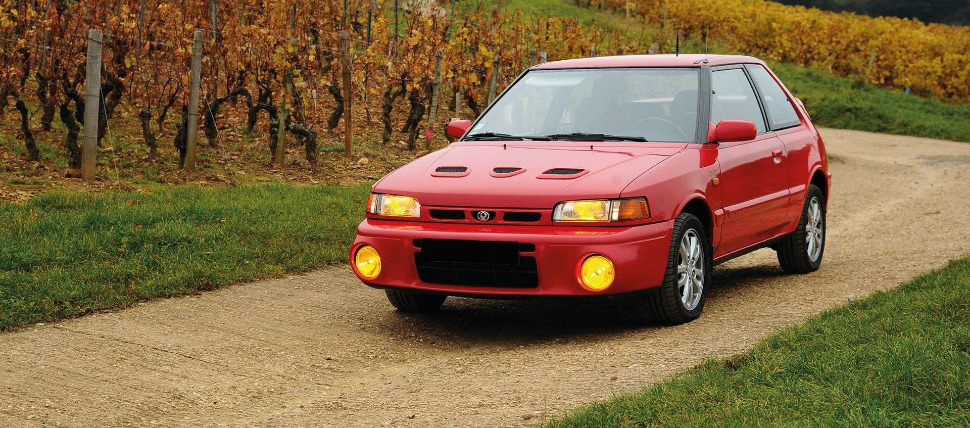 Pour engager une voiture en Gr. A dans les années 1990, le règlement du Championnat du monde des rallyes exige l’homologation d’un certain nombre de véhicules en version routière. Pas moins de 2 200 exemplaires de la 323 GT-R de route seront ainsi écoulés à travers le monde, dont seulement 200 réservés à la France. Mazda pense à l’époque qu’il serait bon pour l’image de la marque de développer un modèle sportif et de l’engager en rallye. La placide familiale 323 est finalement choisie par Warmbold, qui obtient l’accord de Mazda, pour lancer le développement de sa déclinaison préparée pour le rallye en Gr. A. Le moteur est un 1,8 l 16-soupapes Turbo d’une puissance de 210 ch sur le marché japonais, tandis qu’elle chute à 185 ch pour les clients européens à cause du catalyseur. La masse totale de la 323 GT-R, contenue à un peu plus de 1,2 t malgré sa transmission intégrale, lui permet d’afficher un rapport poids-puissance intéressant. La 323 présentée ici est une très rare version française, mise en circulation pour la première fois le 24 août 1993. De couleur rouge avec un intérieur en tissu gris et noir, elle possède toutes les spécificités des voitures destinées à notre marché : les vitres manuelles, et pas de climatisation ni de toit ouvrant. Elle commence sa vie dans la Drôme et reste dans les mains du même propriétaire jusqu’en 2002. Ensuite elle change de département pour parcourir les petites routes du Jura jusqu’en 2018. Elle porte alors l’immatriculation 3073 RN 39. Le propriétaire actuel s’en porte acquéreur en novembre 2019. Cette Mazda sera toujours entretenue avec grand soin comme l’atteste les nombreuses factures jointes au dossier. On peut noter en mars 2011 à 98 186 km, le changement des amortisseurs et des coupelles. En 2018 une grande révision est effectuée avec le remplacement des silentblocs de barre stabilisatrice arrière et la monte de pneus Michelin Pilot Sport 3. En juin 2021 à 13 4865 km, les freins sont changés pour des EBC avec la pose de durits de freins type aviation, et de nouveaux tirants de suspension, le tout en pièces Mazda. Juste avant la vente, la distribution et la ligne d’échappement ont été remplacées également. Un traitement des dessous de caisse fut effectué et aucune corrosion n’est à signaler. La voiture est prête à prendre la route et constitue une alternative vraiment intéressante aux Lancia Delta ou autre Subaru Impreza