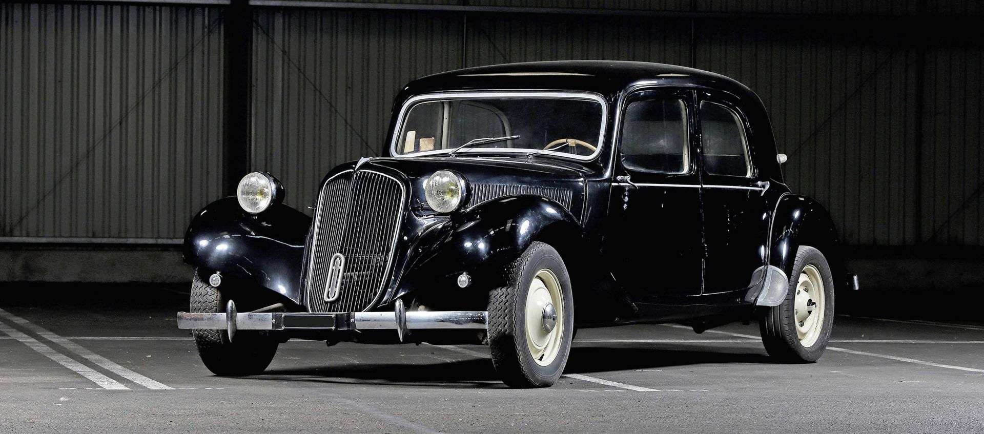 Dévoilée en 1934 pour relancer les ventes de la marque Citröen, celle que l’histoire rebaptisera « Traction Avant » en raison de ses roues motrices à l’avant, particularité rare sur les automobiles de sa catégorie à l’époque, doit son style de carrosserie au designer Flaminio Bertoni. Succédant à différentes versions, la 11B est lancée en 1937. Plus longue, plus large et plus lourde que la 11 BL (pour Légère), cette version dont la construction cessera durant la Seconde Guerre mondiale, sera relancée en mars 1947. En 1952, ce modèle vaste et confortable, mais dotée d’un coffre réduit, hérite d’une malle bombée de grande capacité. De quoi permettre enfin de voyager en famille avec des bagages placés autrement que sur une galerie de toit. La silhouette de la Traction va certes perdre de sa fluidité, mais c’est au bénéfice d’un aspect pratique qui participera au regain d’intérêt à cette période pour la berline du quai de Javel. La Traction 11B présentée dispose d’un ancien titre de circulation italien daté de 1976, de son certificat de conformité délivré par l’Automobile Club de France le 20 septembre 1988 et d’un dossier de photos attestant de son complet démontage en vue de sa restauration réalisée dans les années 1990. Il s’agit ici d’une base intéressante pour l’amateur à la recherche de cette icone populaire française. Nous avons noté que le moteur était bloqué.