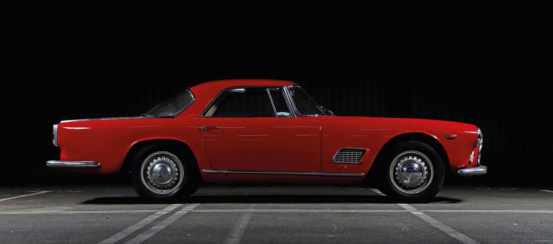 La 3500 GT est considérée comme la première de la lignée des Maserati modernes. En 1957, après avoir remporté le championnat du monde de Formule 1 avec Juan Manuel Fangio au volant d’une 250F, la marque se retire officiellement des sports mécaniques pour se concentrer désormais uniquement sur la production de voitures Gran Turismo. Seules des écuries privées continueront à défendre le sigle au Trident en compétition. Pour Maserati, il s’agit d’élaborer un modèle moderne, raffiné et puissant, produit en nombre, qui soit en mesure de concurrencer Ferrari sur le marché notamment américain. Sur le plan du design, le projet de celle qui sera bientôt baptisée 3500 GT est confié à la Carrozzeria Touring passée maître dans la technique Superleggera. En résulte un profil de carrosserie élégant, équilibré et sportif dissimulant un habitacle 2+2 reposant sur une structure tubulaire. Une multitude de détails complète le style de cette Maserati. A l’image de la prise d’air de son capot nervurée en son centre, des ouïes implantées dans le flanc des ailes avant, des jantes en acier performées ou, mieux encore, celles à rayons signées Borrani. La partie mécanique est l’œuvre de Giulio Alfieri, directeur technique de l’usine de Modène. Celui-ci va développer un moteur 6-cylindres en ligne, à deux arbres à cames en tête et double allumage de 3 485 cm3 (d’où son nom) sur la base de celui qui équipe la 350 S engagée dans les célèbres Mille Miglia, gage de fiabilité et de performances dignes d’une grande GT. Alimenté par deux carburateurs Weber, il développe 220 ch à 5 500 tr/min, et permet à la 3500 GT d’atteindre 230 km/h. En 1961, les carburateurs Weber sont remplacés par un système d’injection mécanique Lucas (GTi) qui augmente la puissance de 15 ch en la faisant passer à 235 ch. La boîte à quatre vitesses (cinq à partir de 1961) se révèle parfaitement étagée, précise et agréable à manœuvrer. Quant au freinage, il est assuré par des disques à l’avant et des tambours à l’arrière. Après seulement trois exemplaires assemblés en 1957, année qui voit Maserati se réorganiser afin de préparer la production de ce modèle en grande série, la fabrication de la 3500 GT est réellement lancée en janvier 1958. Pour parvenir à ses fins sur le plan commercial, le constructeur a également mis en place un large réseau d’importateurs dans des pays stratégiques. De quoi imprimer une nouvelle dynamique et permettre à la marque de sortir de l’ornière financière dans laquelle elle se trouve, et enfin connaître le succès qu’elle mérite. Ainsi de 1957 à 1964, 2 228 exemplaires dont 242 versions Spyder seront produits. Il faut dire que la 3500 GT se révélait quasiment quatre fois moins coûteuse en production que ses concurrentes de Maranello. Cette Gran Turismo, aujourd’hui très recherchée, a définitivement fait entrer Maserati dans une nouvelle ère de son histoire et inspirée la suite de sa gamme. L’exemplaire présenté a été commandé le 3 mars 1960 et livré le 20 juillet 1960 au concessionnaire de la marque à Vicenza, pour être vendu à Valentino Malucelli. Cette 3500 GT devient ensuite la propriété de Caroli Sergio en juin 1965. Puis d’un américain, Myron Akerman, domicilié en Italie, le 30 novembre 1975. Elle connaîtra ensuite cinq propriétaires italiens successifs avant de rejoindre la collection Anna Lisa. La voiture, dont le compteur affiche 86 166 km, fut vraisemblablement livrée neuve de couleur noire . Mais sa teinte rouge actuelle lui va à ravir, et il conviendra à son futur propriétaire de choisir entre laisser cette iconique et racée GT dans ce beau jus d’origine, ou bien entreprendre une restauration dans sa configuration d’origine.