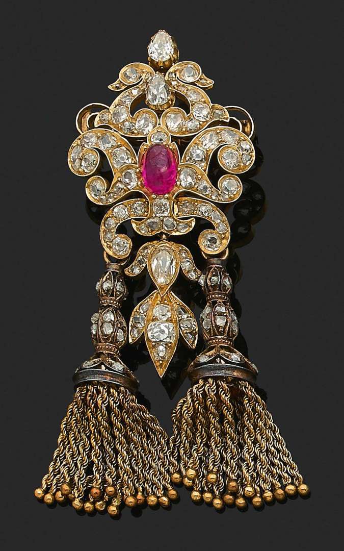 Diamants taille ancienne et roses, rubis, or 14k (585)
