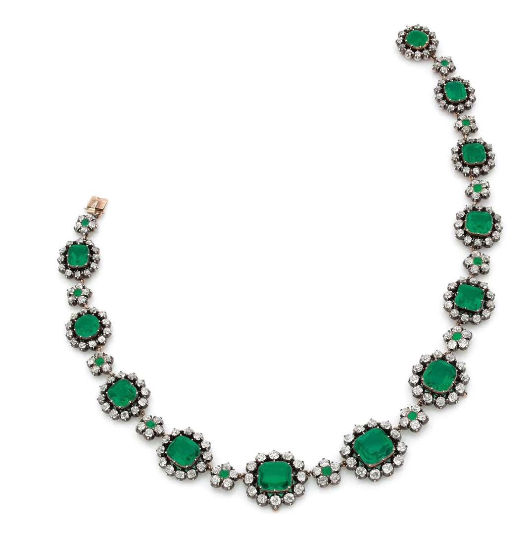 Émeraudes et diamants taille ancienne. Or 18k (750) et argent (<800). Début XIXe. Long. : 34 cm - Pb. : 45. 8gr. Accompagné d'un certificat LFG attestant : Poids estimé des émeraudes : 27.1 carats, Origine : Colombie, Couleur : Vert vif, Faible présence d'huile
