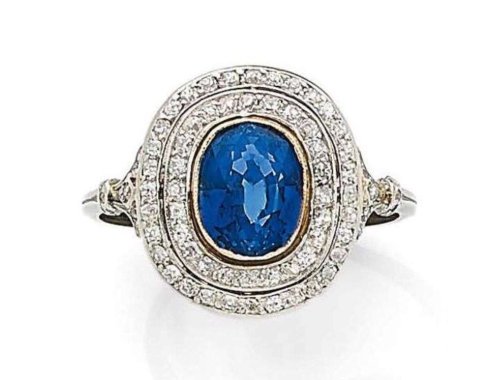 A sapphire, diamond, platinum and gold ring