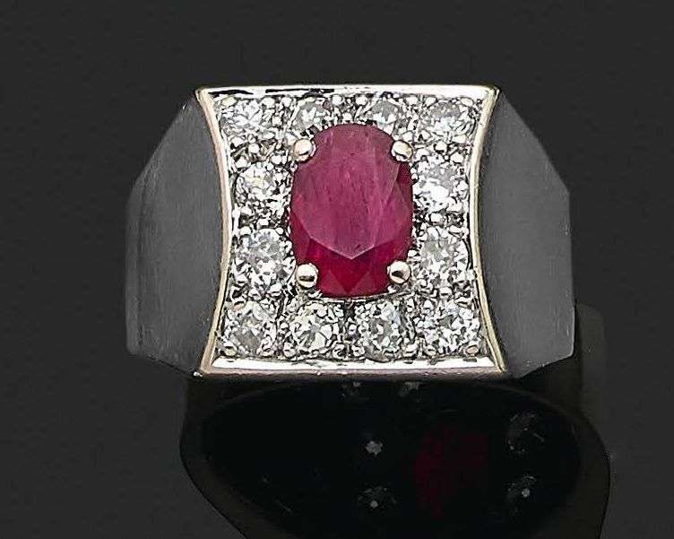 BAGUE Pavage de diamants taille ancienne, rubis ovale