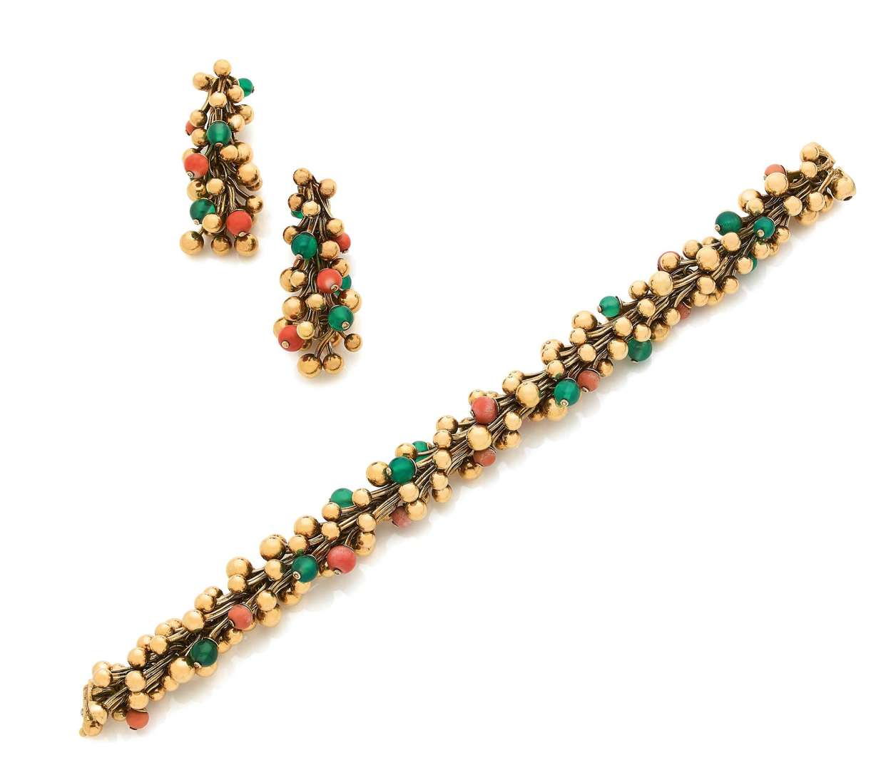 A coral, chrysoprase and gold bracelet and earrings, signed Van Cleef & Arpels
