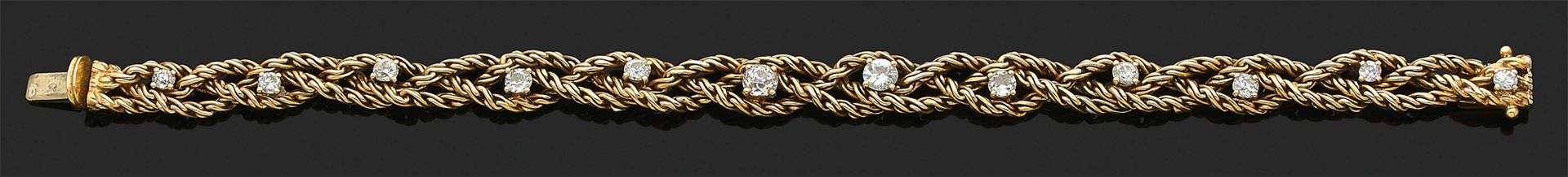 Bracelet or jaune tressé 18k (750). Diamants taille ancienne. Signé et numéroté. L. : 18 cm - Pb. : 23.6 gr. A diamond and gold bracelet, signed Chaumet