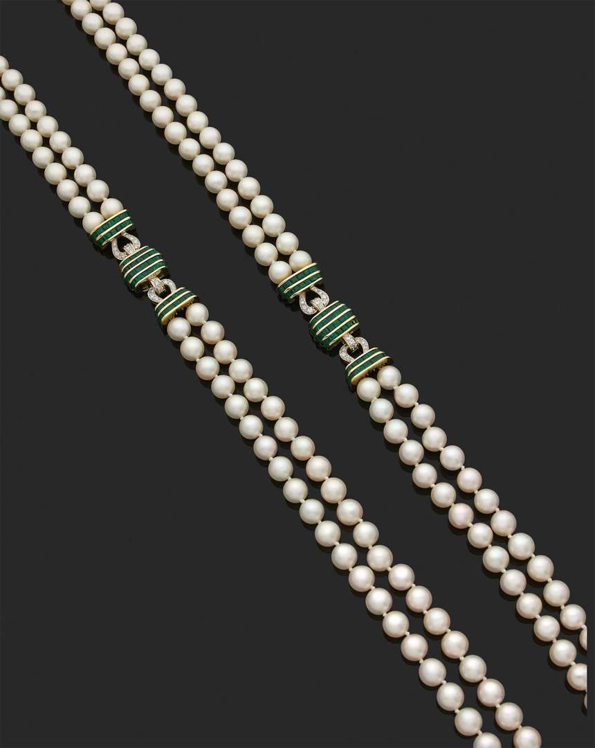 SAUTOIR DE PERLES DE CULTURE Motifs émeraudes, diamants, or 18k (750)