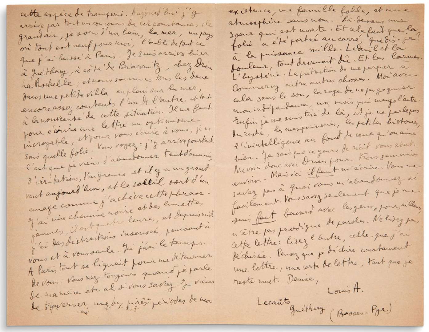 «Oui je suis ce fantoche à la cantonade, ce fantôme. Une ombre assez solitaire et bien seule. Oh vous ne pouvez pas vous imaginer combien j'ai été seul depuis mon départ de chez vous.» «Je suis arrivé hier à Guéthary, chez Drieu La Rochelle et nous sommes tous les deux dans une petite villa, en plein sur la mer, encore assez contents l'un de l'autre.» «Ne lisez pas cette lettre, lisez l'autre, celle que j'ai déchirée. Pensez que je déchire constamment une lettre, une sorte de lettre, tant que je reste muet» ...