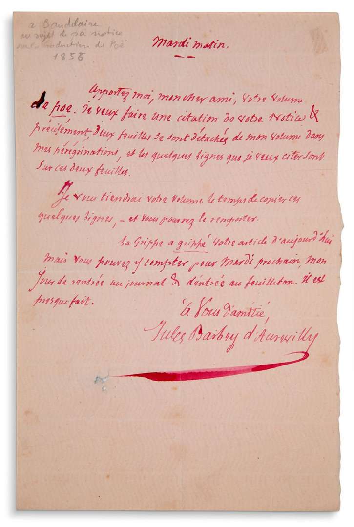 Superbe document calligraphié à l'encre rouge. La clairvoyance littéraire de Barbey et le génie ombrageux de Baudelaire. Barbey, critique au périodique Le Pays, avait éreinté le 17 juillet 1853 la traduction de contes d'Edgar Allan Poe donnée par Amédée Pichot, en regrettant que