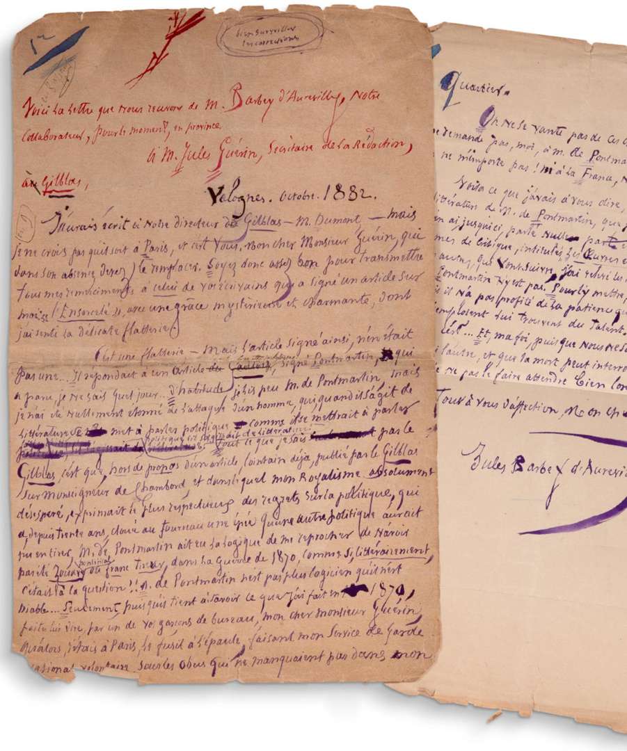 Superbe lettre de Barbey d'Aurevilly, à l'encre violette, à Jules Guérin, secrétaire de la rédaction au Gil Blas, se défendant, vigoureusement et avec mépris, des attaques du critique Armand de Pontmartin.