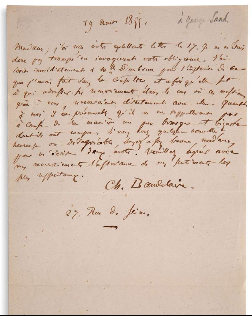 Cette lettre est l'une des deux seules connues de Baudelaire à George Sand, toutes deux relatives à un service que le poète demanda pour sa maîtresse