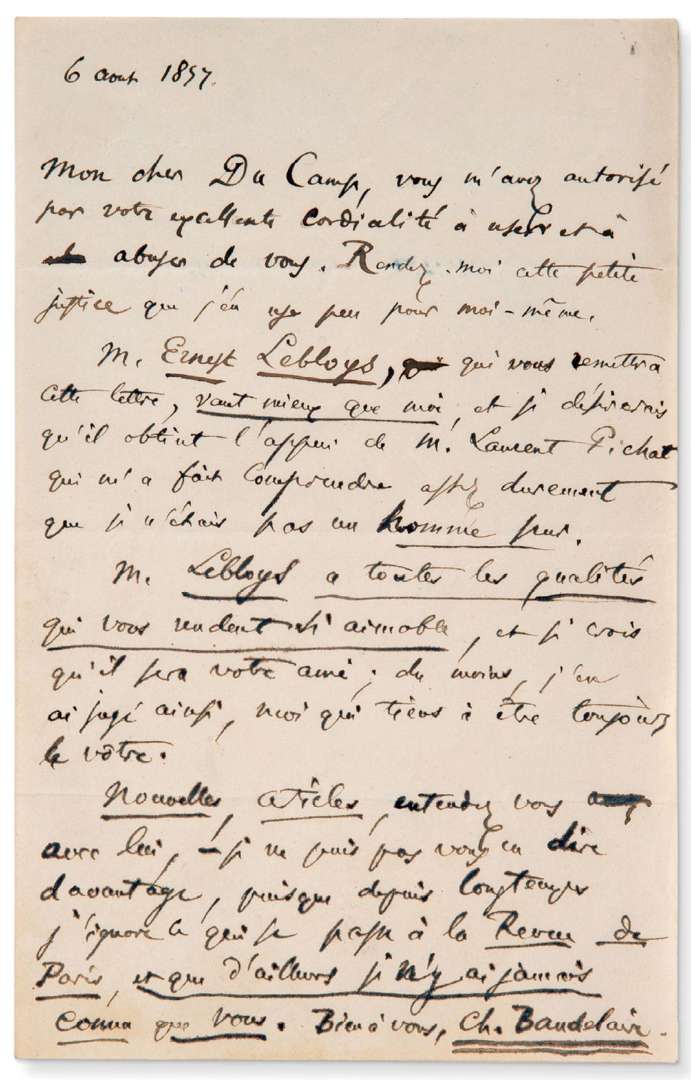 Puisqu'il n'en use peu pour lui-même, Baudelaire sollicite l'intervention de Du Camp auprès de Laurent-Pichat , tous deux fondateurs de la Revue de Paris, afi n que son vieil ami le républicain Ernest Lebloys puisse y publier nouvelles, articles... car Baudelaire n'est pas un “homme pur” aux yeux du républicain Laurent-Pichat. “(...) M. Lebloys a toutes les qualités qui vous rendent si aimable, et je crois qu'il sera votre ami | du moins, j'en ai jugé ainsi, moi qui tiens à être toujours le vôtre.”