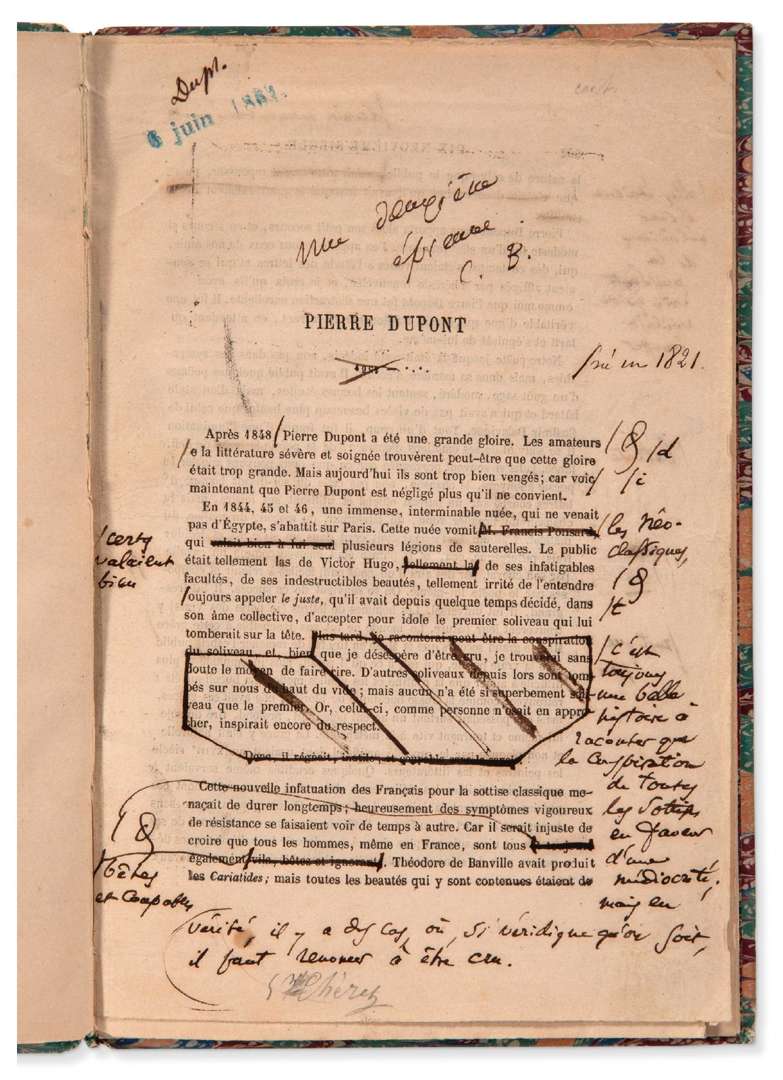 Épreuve abondamment corrigée de la seconde notice sur Pierre Dupont, signée en première page par Baudelaire de son monogramme. Destinée à une anthologie éditée par Eugène Crépet : Les Poètes français, Recueil des chefs-d'oeuvre de la Poésie française (tome IV, Paris, 1862), elle paraît dans la Revue fantaisiste du 15 août 1861.