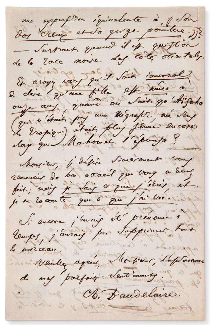 Lettre autographe signée de Baudelaire à l'éditeur Gervais Charpentier, directeur de la Revue Nationale et étrangère. Baudelaire, très mécontent, lui fait part de sa désagréable déconvenue de constater que ses textes, publiés dans la Revue nationale, ont été corrigés sans son accord : «Je viens de lire les deux extraits (Les Tentations et Dorothée) insérés dans la Revue Nationale. J'y trouve d'extraordinaires changements introduits après mon bon à tirer. [...] J'ai passé ma vie entière à apprendre à construire des phrases, et je dis, sans crainte de faire rire, que ce que je livre à une imprimerie est parfaitement fi ni.»