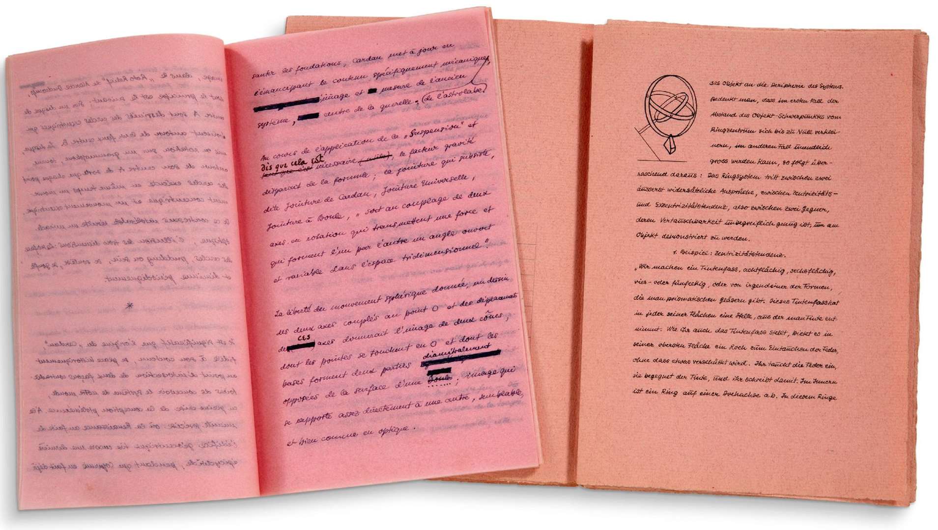 Deux manuscrits autographes et dessins originaux de la préface aux «Jeux de la poupée». Manuscrits en allemand (23 pages) et en français (22 pages), 6 dessins originaux. 1949. 45 pages-8.