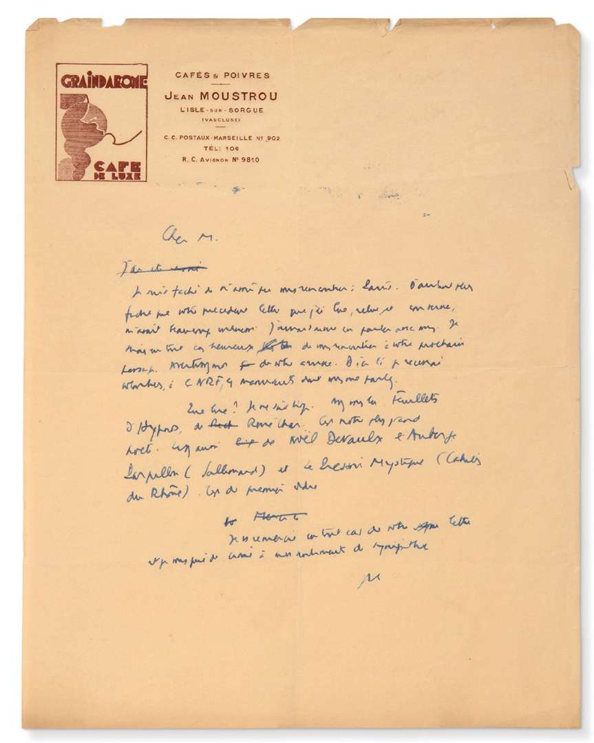 Lettre autographe monogrammée (minute), [vers 1948] | 1 page in-4, vignette et en-tête de Graindarome Cafés & Poivres Jean Moustrou