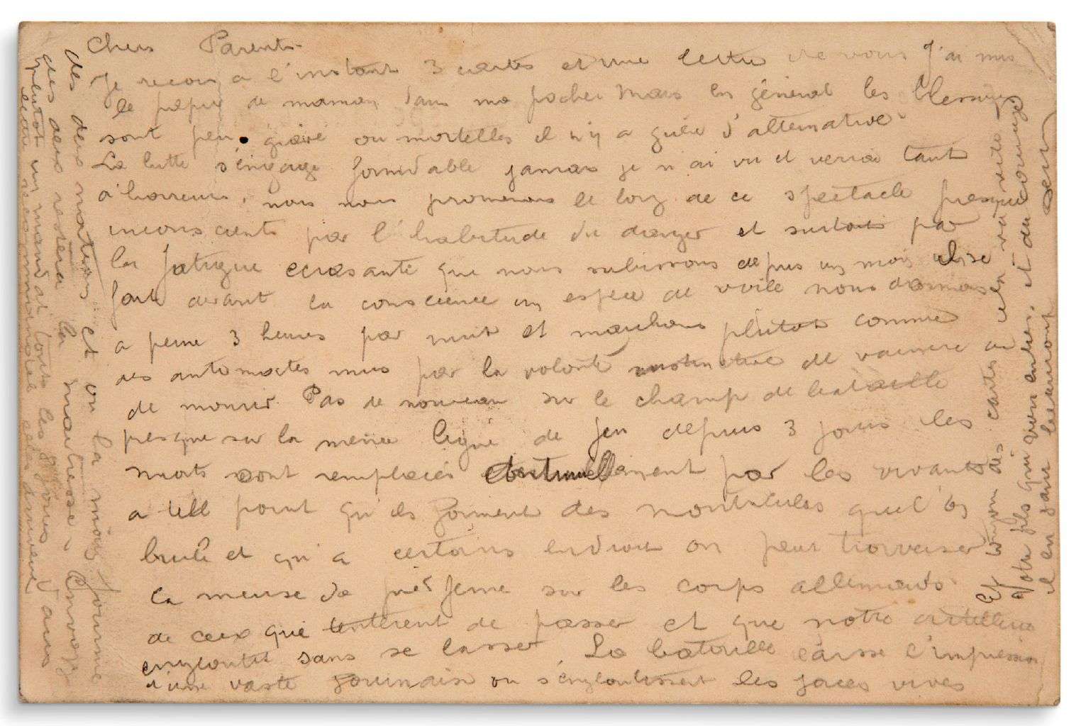 «Chers parents, je reçois à l'instant 3 cartes et une lettre de vous. J'ai mis le papier de maman dans ma poche mais en général les blessures sont peu graves [sic] ou mortelles, il n'y a guère d'alternative. La lutte s'engage formidable, jamais je n'ai vu et verrai tant d'horreur, nous nous promenons le long de ce spectacle presque inconscient par l'habitude du danger et surtout par la fatigue écrasante que nous subissons depuis un mois. Il se fait avant la conscience une espèce de voile. Nous dormons à peine 3 heures par nuit et marchons plutôt comme des automates mus par la volonté instinctive de vaincre ou de mourir. Pas de nouveau sur le champ de bataille. Presque sur la même ligne de feu depuis 3 jours. Les morts sont remplacés continuellement par les vivants à tel point qu'ils forment des monticules que l'on brûle et qu'à certains endroits on peut traverser la Meuse à pied ferme sur les corps allemands de ceux qui tentèrent de passer et que notre artillerie engloutit sans se lasser. La bataille laisse l'impression d'une vaste fournaise où s'engloutissent les forces vives de deux nations et où la moins fourbue des deux restera la maîtresse. Envoyez plutôt un mandat tous les 8 jours. Vos lettres recommandées elles arrivent.