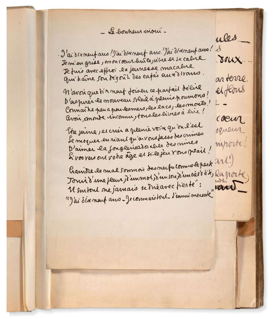 Lettre de la jeune fi lle de province à la jeune fi lle de Paris, Le dieu nu [signé JC], La nuit quitte un parc, À la fenêtre, Seine et Oise, Soir inutile et sympathique, Le rondel de la langue [au dos, Le géant chapeau bleu, 1ère version biff ée], Le gardénia, Rondel de l'énorme chapeau, L'air des sept princes, Rondel des deux éléphants, La promenade [signé JC], Les parfums japonais, Mr W.H., Le sommeil du jardin [signé JC], Souvenir,