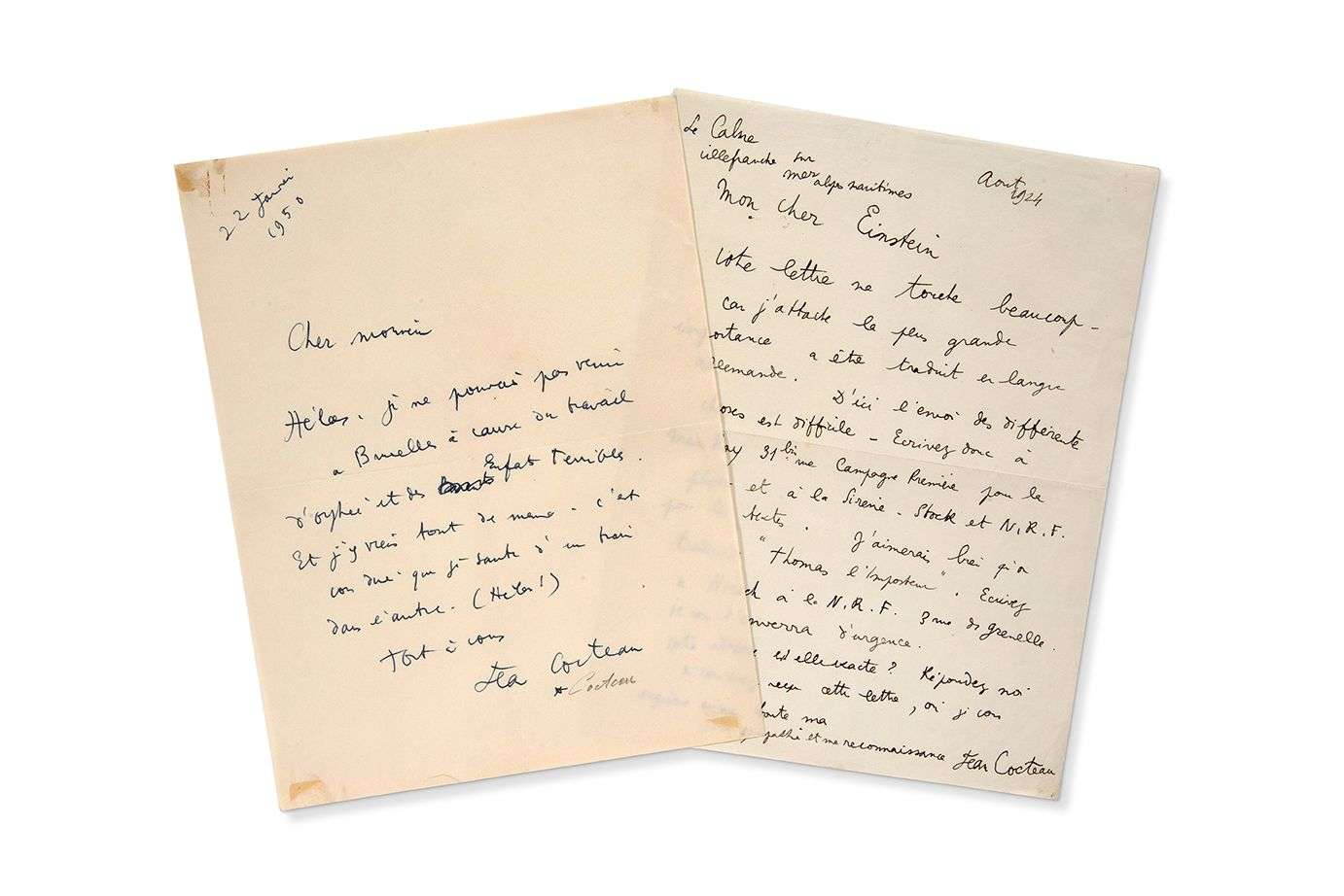 On joint une autre lettre autographe signée, 22 janvier 1950 (1 p. in-4) : «Hélas, je ne pouvais pas venir à Bruxelles à cause du travail d'Orphée et des Enfants terribles. Et j'y viens tout de même - c'est vous dire que je saute d'un train dans l'autre» ...
