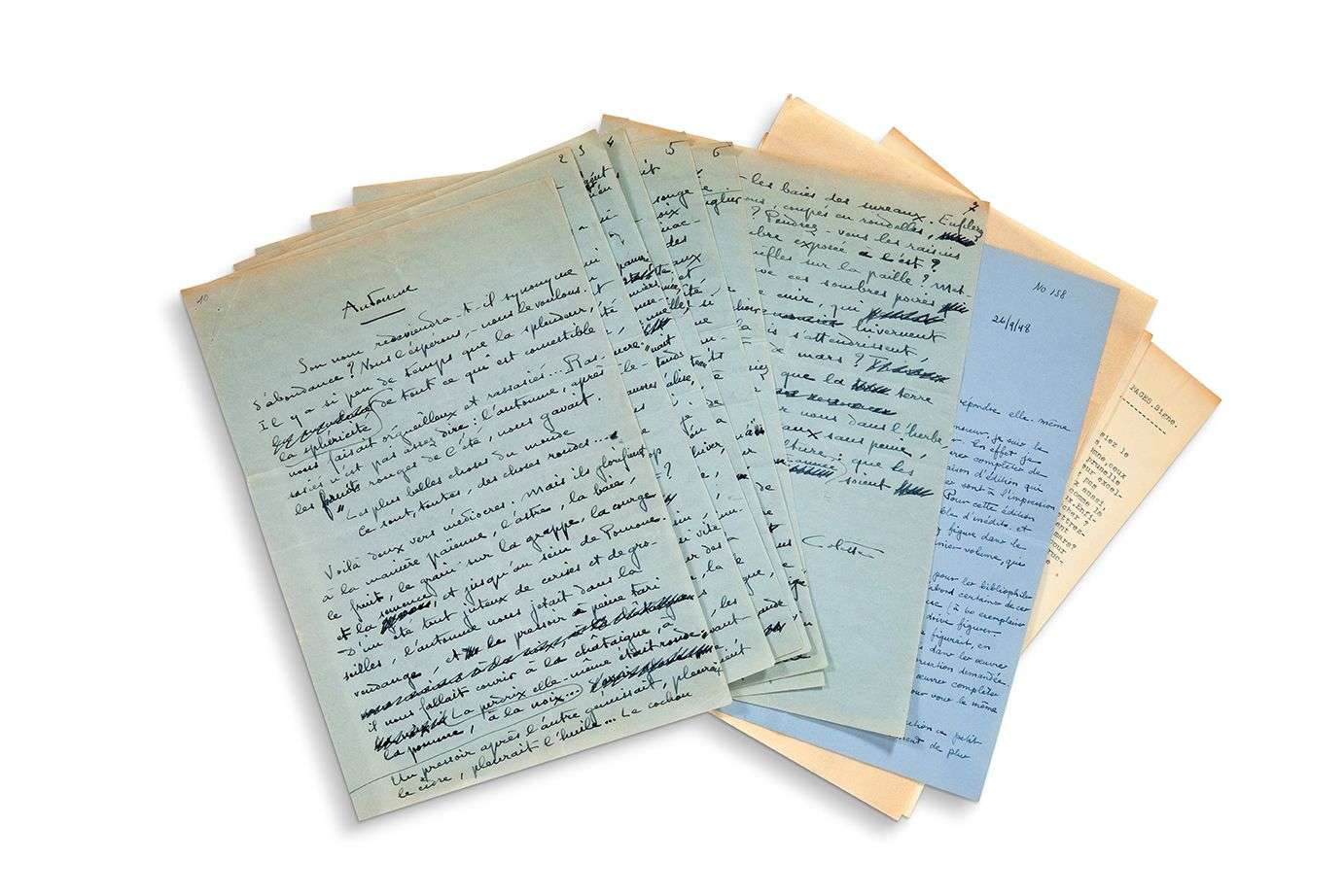 Automne, manuscrit autographe | 7 pages in-4 à l'encre sur papier bleu, nombreuses ratures et corrections.