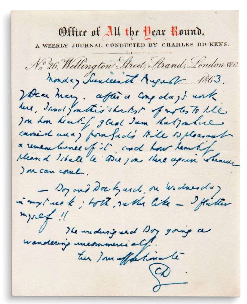 Lettre autographe signée à Mary BOYLE, papier en-tête «Offi ce of All The Year Round. / A Weekly Journal conducted by Charles Dickens», 17 août 1863 | 1 page in-16 à l'encre.