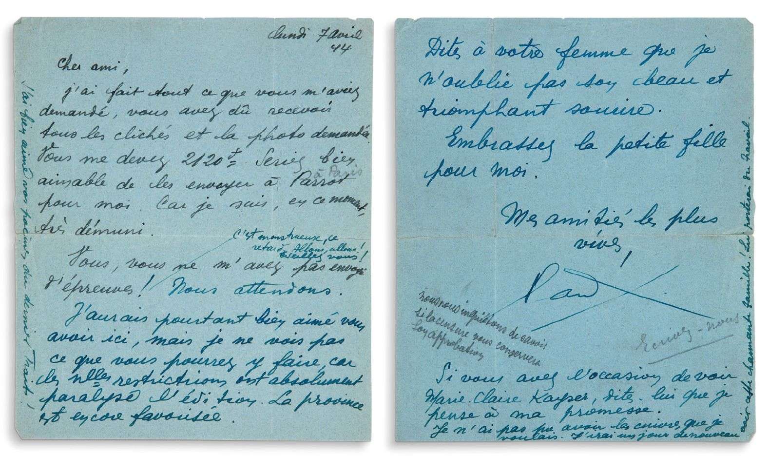 «... Vous avez dû recevoir tous les clichés et la photo demandée. Vous me devez 2120 F... je suis, en ce moment très démuni...» Quant aux épreuves,