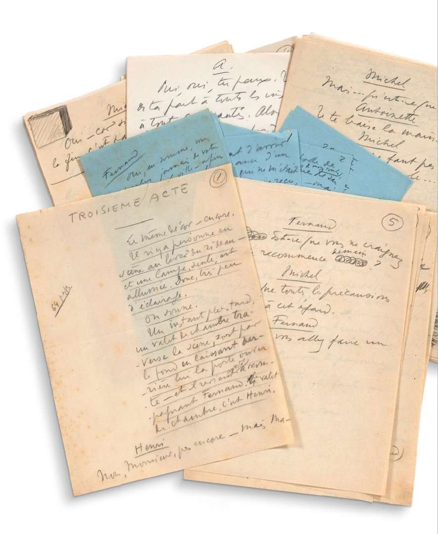 Fragments du manuscrit de travail du troisième acte (et dernier) de cette comédie créée le 6 mai 1949 au Théâtre du Gymnase, par Sacha Guitry et Lana Marconi.