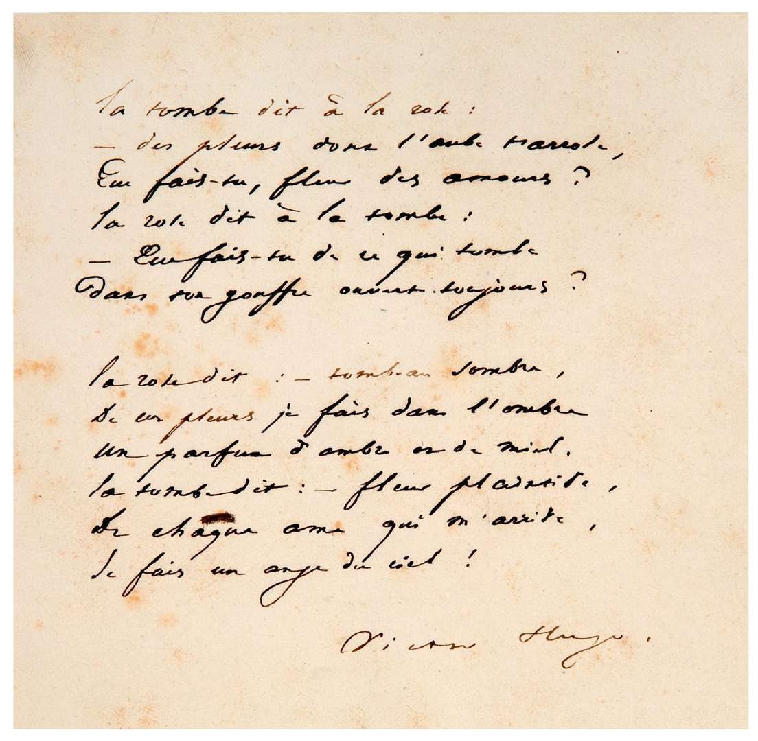 Sur une page d'album, Hugo a transcrit l'avant-dernier poème des Voix intérieures (1837) : «La tombe dit à la rose :