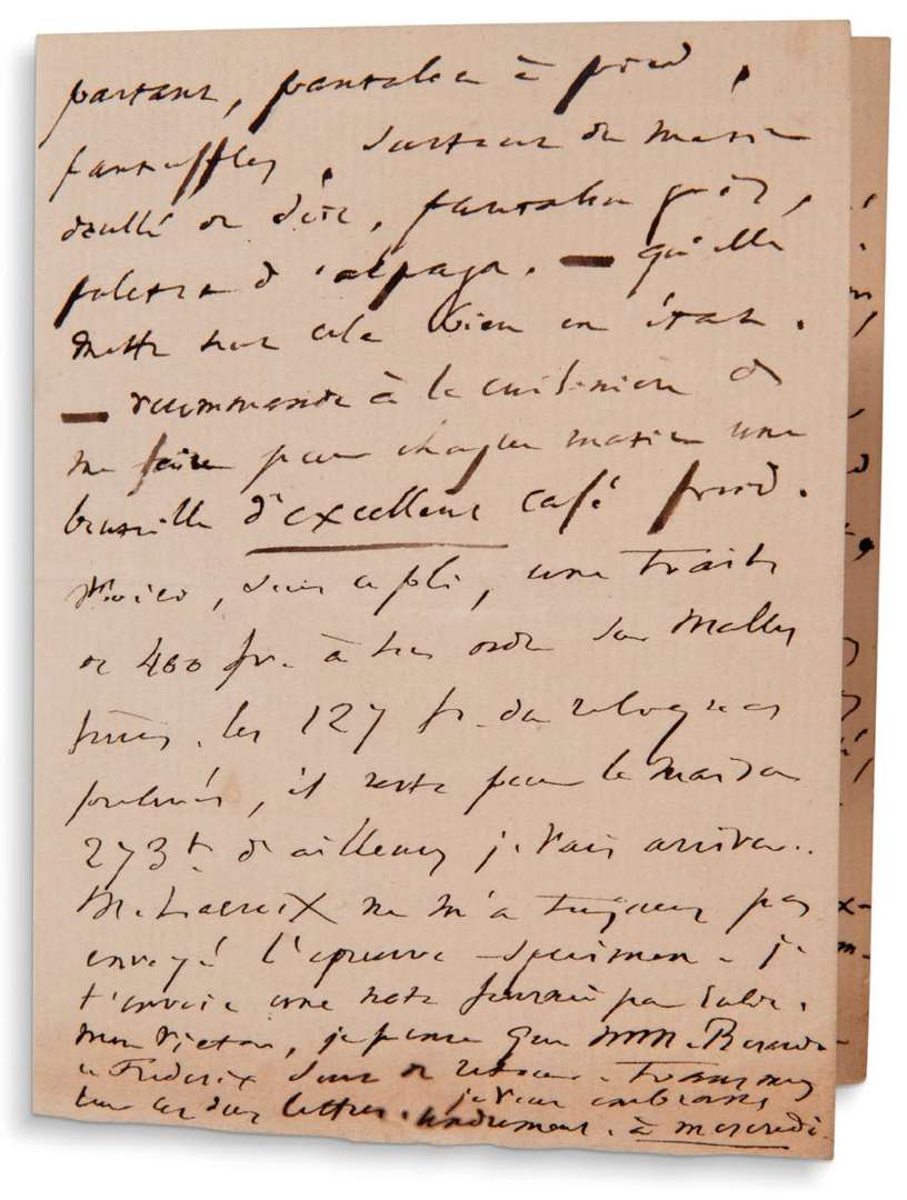 «Je compte partir lundi 15 et arriver à Bruxelles, Deo volente, mercredi 17. J'ai écrit à Charles. Chère femme bien-aimée, mon Victor, je vais être bien heureux de vous serrer dans mes bras. Faites préparer ma chambre dans la maison du fond comme elle était, tout simplement, avec une ou deux servantes (plutôt deux qu'une) couchées dans le compartiment voisin. J'ai toujours des spasmes nocturnes, sans gravité, je crois, mais qui pourraient rendre dangereux l'isolement absolu. Le voyage est un topique contre ces surexcitations nerveuses» ... Il donne aussi des instructions pour la femme de chambre et la cuisinière, et se plaint de son éditeur : «M. Lacroix ne m'a toujours pas envoyé l'épreuve spécimen».