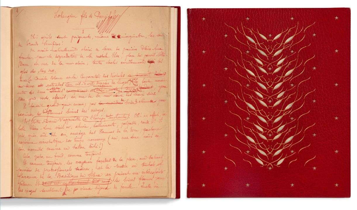 17 feuillets in-4 autographes à l'encre rouge. Maroquin rouge, dos long avec titre doré, décor sur les plats d'étoiles et d'épis en maroquin blanc mosaïqué et de filets dorés. Tête dorée.