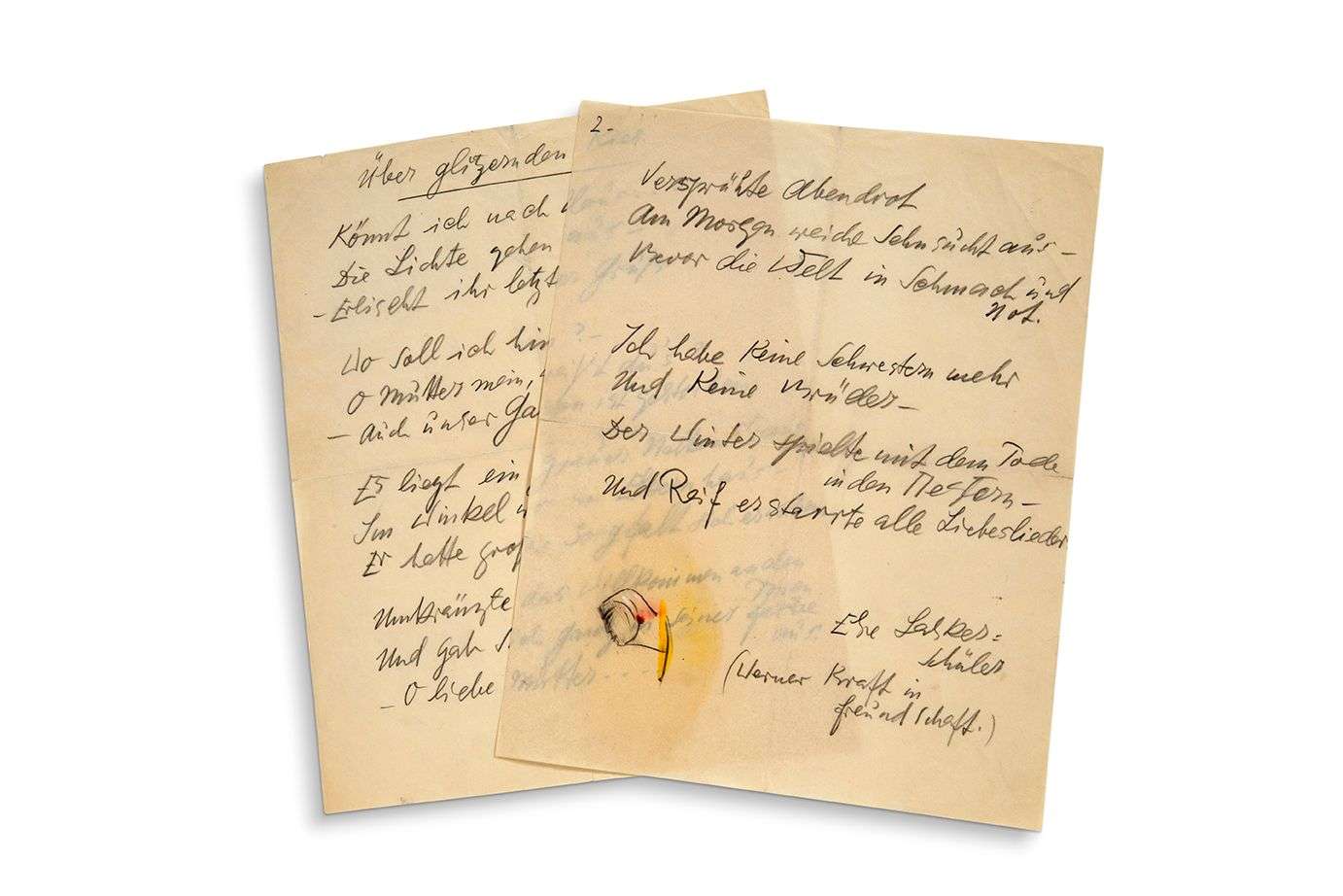 Uber glitzernden Kies, poème autographe signé et illustré d'un petit dessin original. 2 pages in-4 en crayon (pliures)
