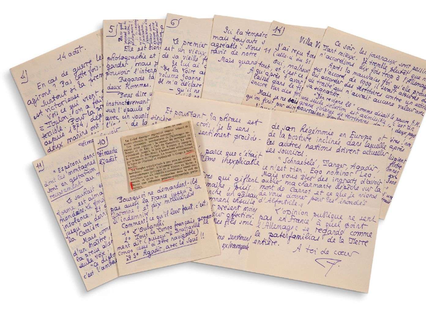 Velléda 4 septembre [1911] | 20 pages petit in-8 (180 x 135 mm) et 5 pages in-12 (156 x 112 mm), les 8 lettres à l'encre violette sur papier vélin fi ligrané Ducal Crown dont une lettre ne semble pas complète (découpé par le milieu) | lettres numérotées «4» à «7», puis «10», «11» et «14», 4 coupures de presse sont jointes dont 2 collées sur la lettre n°10 soulignées au crayon rouge | une enveloppe à l'adresse de Georges Louis comme ambassadeur de France à Saint-Pétersbourg (timbres, marques postales, cachets postaux russes) sur la situation internationale extrêmement tendue, ce qui ne semble pas déplaire à Pierre