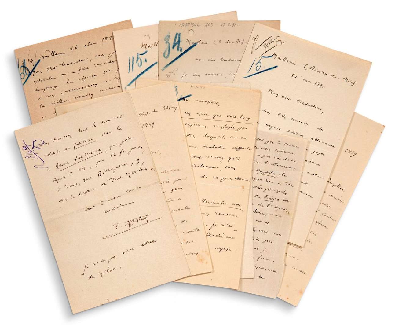 Ensemble de neuf lettres autographes signées à son traducteur allemand Auguste BERTUCH, Maillane du 4 avril 1889 au 29 août 1893 | 31 pages in-12 (178 x 114 mm) à l'encre noire sur 9 doubles feuillets vergé fi ligrané. Crayon de typographe et perforation dans la partie supérieure du premier feuillet de 4 des lettres de cet ensemble.