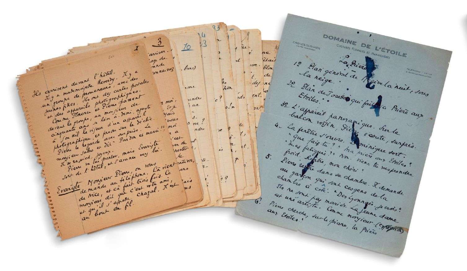 L'on joint une page in-4 autographe de Pagnol de synopsis titrée La Prière (taches d'encre).
