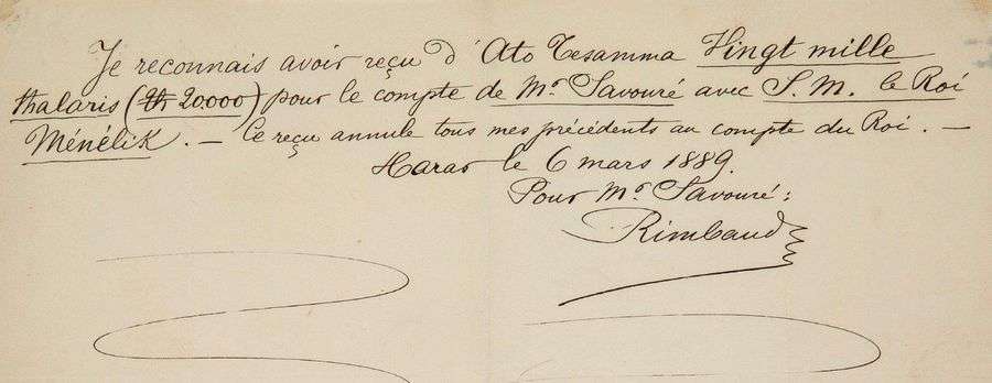 Reçu autographe à l'encre d'une écriture appliquée daté, signé et illustré par Arthur Rimbaud de lignes à l'encre remplissant la page en dessous du texte autographe. «Je reconnais avoir reçu d'Ato Tesamma Vingt mille thalaris (th20000) pour le compte de Mr Savouré avec S.M. le Roi Ménélik. - Ce reçu annule tous mes précédents au compte du Roi. - Harar le 6 mars 1889. Pour Mr Savouré : Rimbaud».