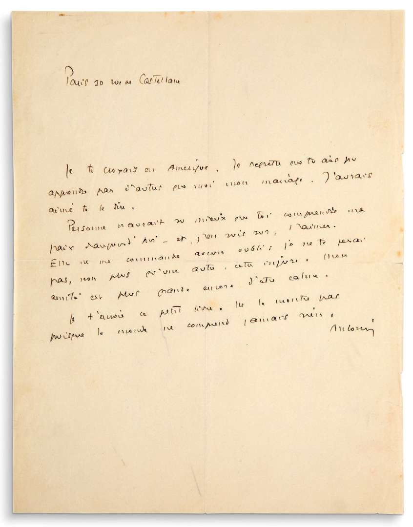 «Je te croyais en Amérique. Je regrette que tu aies pu apprendre par d'autres que moi mon mariage. J'aurais aimé te le dire. Personne n'aurait su mieux que toi comprendre ma paix d'aujourd'hui - et, j'en suis sûr, l'aimer. Elle ne me commande aucun oubli : je ne te ferai pas, non plus qu'une autre, cette injure. Mon amitié est plus grande encore d'être calme. Je t'envoie ce petit livre. Ne le montre pas puisque le monde ne comprend jamais rien».