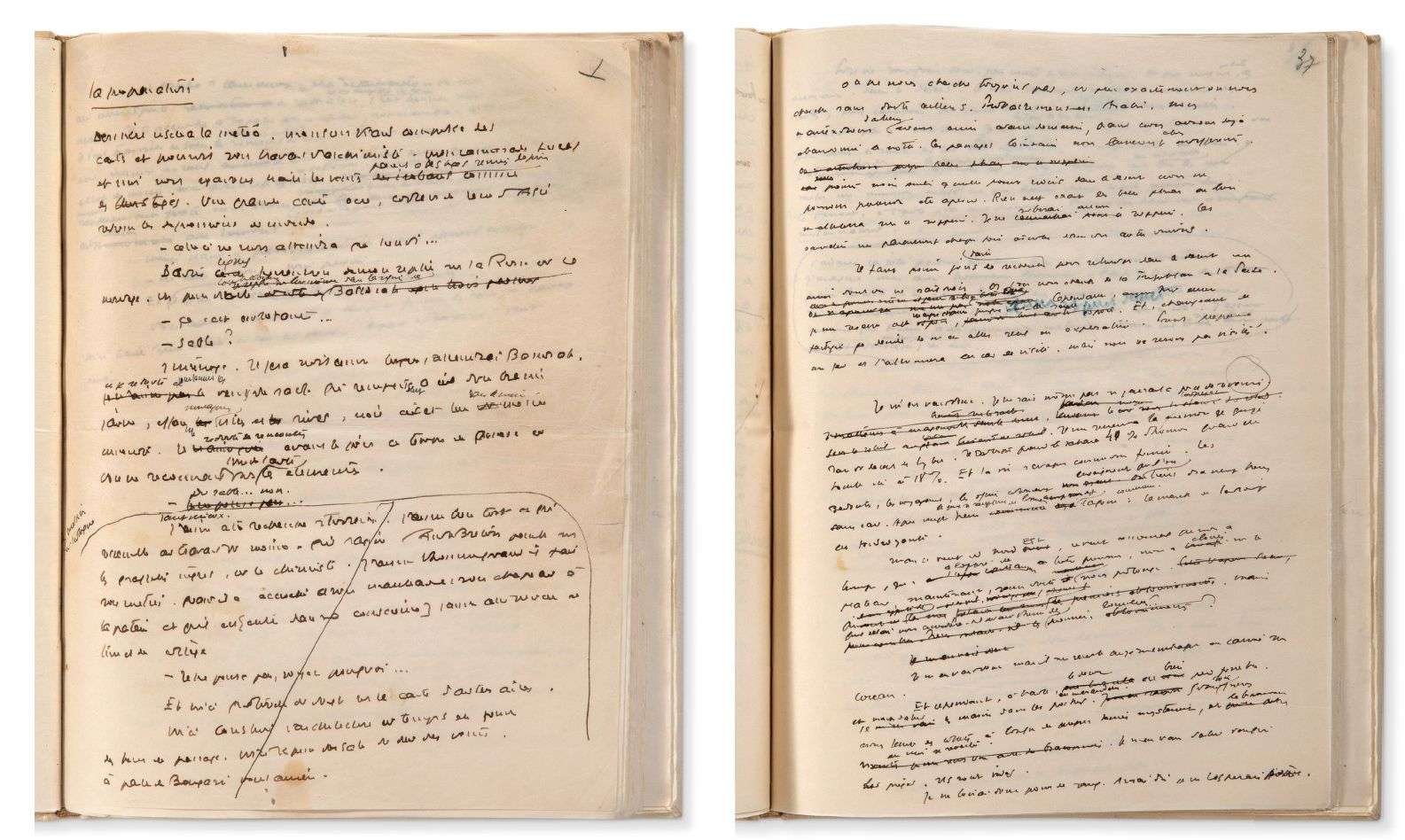 Au centre du désert, manuscrit autographe, abondamment raturé et corrigé. [Janvier 1936]. 55 p. sur 62 feuillets in-4 de papier fi n, (les f. 12, 24, 45 et 58 blancs), encre bistre, crayon noir et bleu, foliotation partielle autographe, Bradel vélin ivoire, titre en long sur le dos. Quelques déchirures et pliures marginales, reliures un peu salle et frottée.