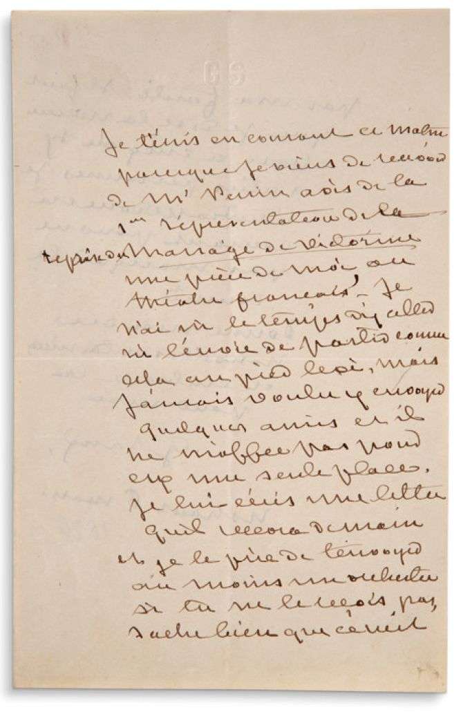 George Sand souhaite off rir une place de théâtre à Flaubert. «Je t'écris en courant ce matin parce que je viens de recevoir de Mr Perrin avis de la 1ère représentation de la reprise du Mariage de Victorine une pièce de moi au théâtre français. Je n'ai ni le temps d'y aller ni l'envie de partir comme cela au pied levé, mais j'aurais voulu y envoyer quelques amis et il ne m'off re pas une seule place». Elle a écrit pour qu'on adresse à