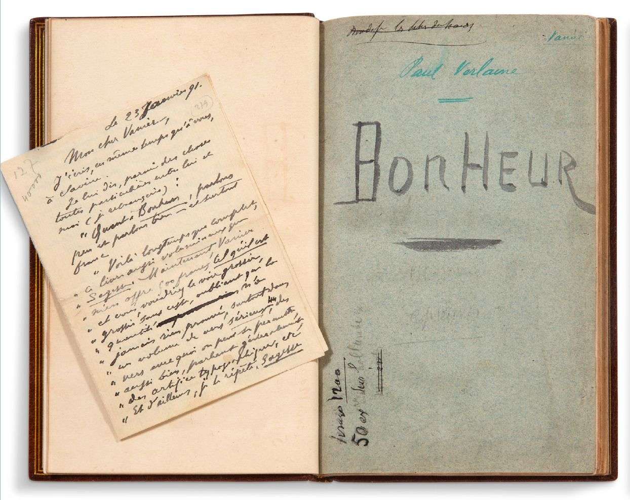 L'on joint une importante lettre autographe signée de Paul Verlaine à l'éditeur Léon Vanier, lettre formidable relative à Bonheur, 4 pages in-12 à l'encre.
