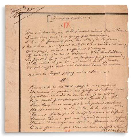 Poème autographe intitulé Imprécations. Ce poème constitue la pièce IX du recueil Dans les Limbes. Le présent manuscrit a servi pour l'impression de l'ouvrage qui paraît en mai 1894 chez Vanier. Le poème se compose de deux dixains, numérotés I et II | le titre et la numérotation n'ont pas été retenus dans l'édition. Le manuscrit a servi pour l'impression. Dans le coin supérieur gauche, Verlaine a inscrit le titre Dans les Limbes.
