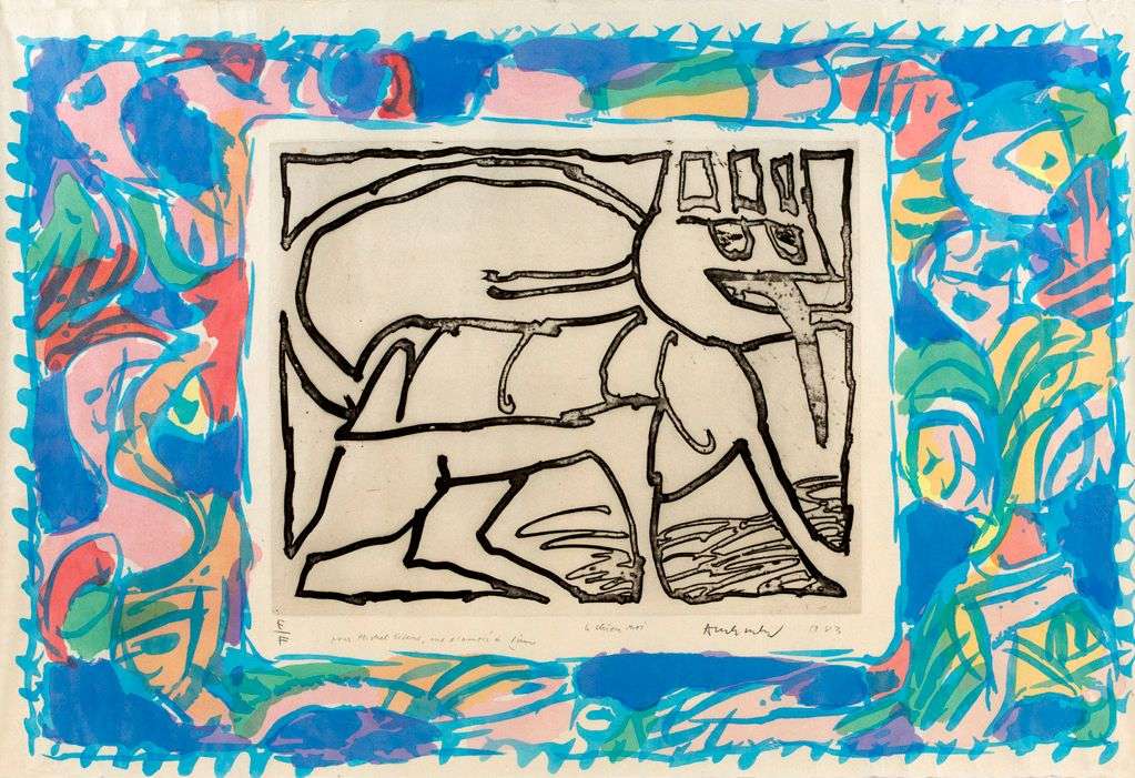 Épreuve hors commerce, numérotée E/F, imprimée sur papier Japon à la forme dédicacée, titrée, signée et datée au crayon: «pour Michel Sicard, avec l'amitié de Pierre / Le Chien roi Alechinsky 1983».